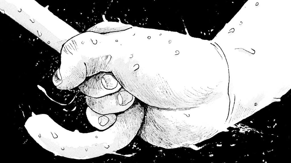 Uno dei momenti che ho amato di più è quando vediamo Chosuke, che, proprio mentre si arrendeva al fatto di non riuscire più a disegnare nulla per la nuova rivista, decide di fare una passeggiata sotto la pioggia. Durante questa passeggiata perde l’ombrello e sceglie di rincorrerlo. Nell’istante in cui riesce ad afferrarlo, è come se venisse travolto da un’ondata di idee e riacquistasse il suo amore per i manga. Da lì in poi, si precipita nel bar dove aveva lasciato tutta l’attrezzatura da disegno, per buttare giù il più velocemente possibile tutto ciò che gli è venuto in mente.